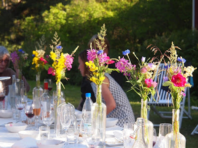 tulevan. Pitkä pöytä nurmikolla sai valkoiset liinat ja solakat kukkavaasit.